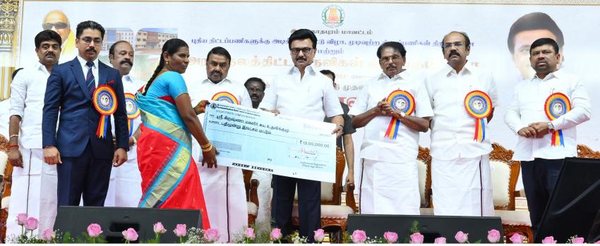 ஊரக வளர்ச்சி மற்றும் ஊராட்சித் துறை சார்பில், 10,459 பயனாளிகளுக்கு கலைஞரின் கனவு இல்லம், பழுதடைந்த வீடுகள் சீரமைக்கும் திட்டம், முதலமைச்சரின் வீடுகள் மறுகட்டுமான திட்டம், மண்டபம் முகாமில் இலங்கை தமிழர் நலன் திட்டம், மீனவர்களுக்கான வீடுகள் திட்டம் ஆகிய திட்டங்களின் கீழ் வீடுகள்,
