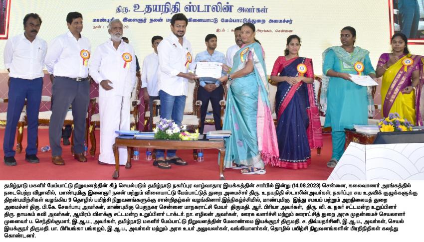 தமிழ்நாடு மகளிர் மேம்பாட்டு நிறுவனத்தின் கீழ் செயல்படும் தமிழ்நாடு நகர்ப்புர வாழ்வாதார இயக்கத்தின் சார்பில் இன்று (14.08.2023) சென்னை, கலைவாணர் அரங்கத்தில் நடைபெற்ற விழாவில், மாண்புமிகு இளைஞர் நலன் மற்றும் விளையாட்டு மேம்பாட்டுத் துறை அமைச்சர் திரு. உதயநிதி ஸ்டாலின் அவர்கள், பெருநகர சென்னை மாநகராட்சியில் செயல்படும் 1808 நகர்ப்புர சுய உதவிக் குழுக்களைச் சேர்ந்த 23,424 மகளிர் சகோதரிகள் பயன் பெறும் வகையில் 100 கோடி ரூபாய் வங்கிக் கடன் இணைப்புகள், உணவுத் தர பயிற்சி பெற்று சான்றிதழ் பெறவுள்ள 182 நகர்ப்புர சாலையோர வியாபாரிகளில் 50 நபர்களுக்கு இன்றைய தினம் உணவு தரச் சான்றிதழ், திறன் பயிற்சி பெற்ற 100 இளைஞர்களுக்கு ஓட்டுநர் உரிமங்கள் மற்றும் பணி நியமன ஆணைகள், சுய உதவிக் குழுக்களைச் சார்ந்த சிறு தொழில் முனைவோர்களுக்கு கடனுதவிகள், நகர்ப்புர சுய உதவிக் குழுக்களுக்கு சிறப்பான முறையில் வங்கிக் கடன்கள் வழங்கிய ஆறு வங்கிகளுக்கு வங்கியாளர் விருதுகள் மற்றும் 9 தொழில் பயிற்சி நிறுவனங்களுக்கு சான்றிதழ்கள் ஆகியவற்றை வழங்கி விழாப் பேருரையாற்றினார்.